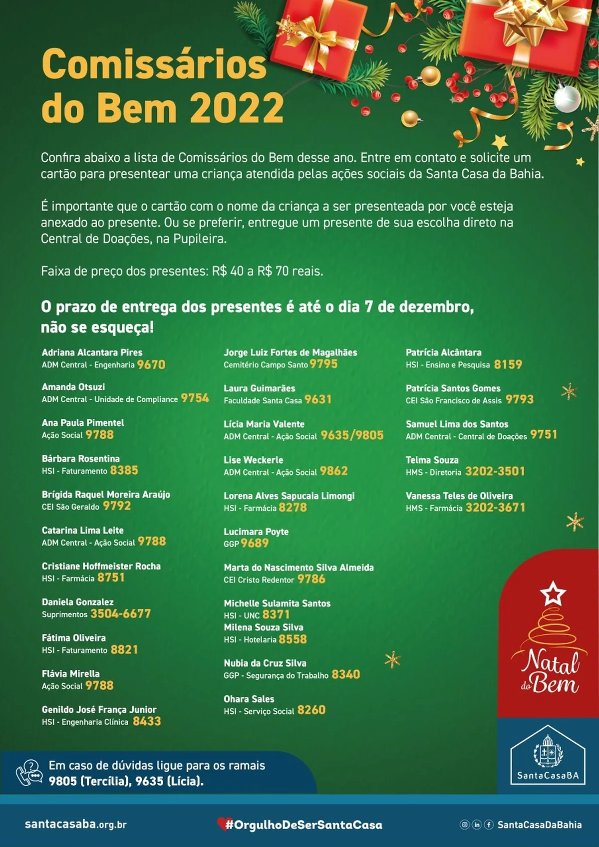 Os presentes, com valores entre R$ 40 e R$ 70, podem ser doados até o dia 7 de dezembro aos chamados “Comissários do Bem”, que são colaboradores da Santa Casa da Bahia que voluntariamente têm a missão de realizar a arrecadação.